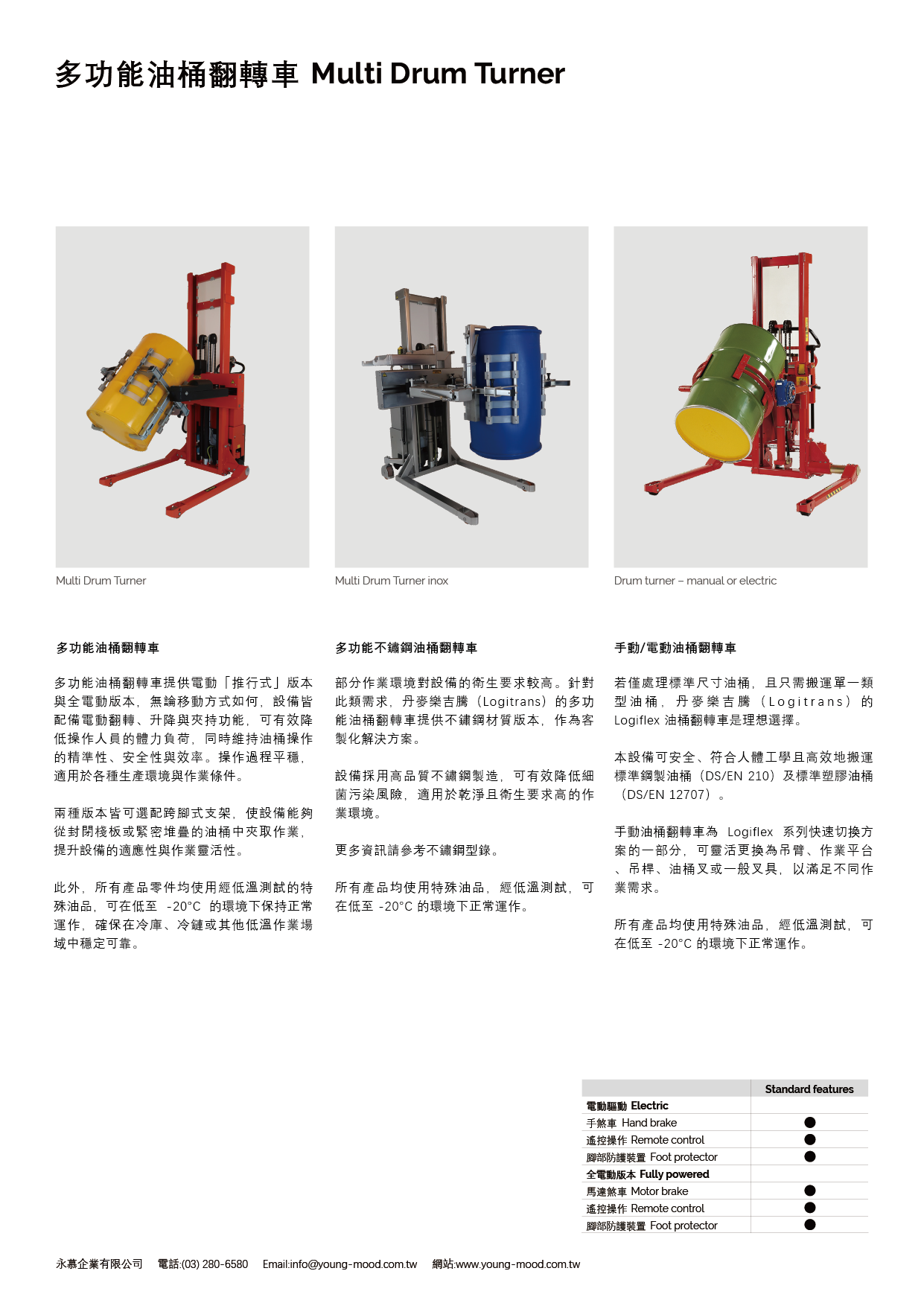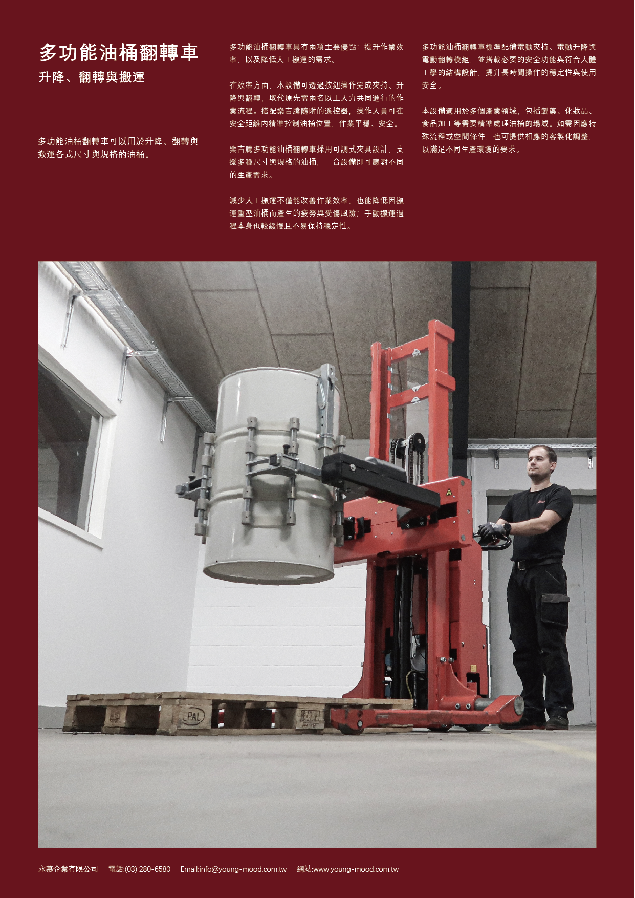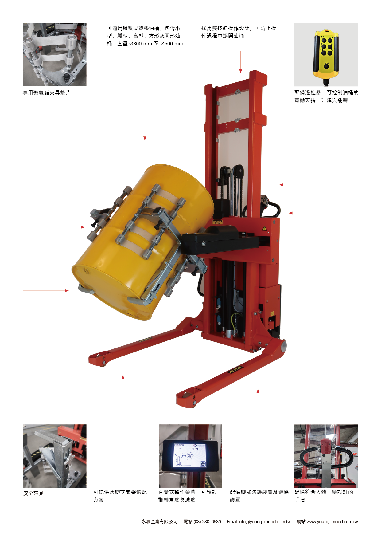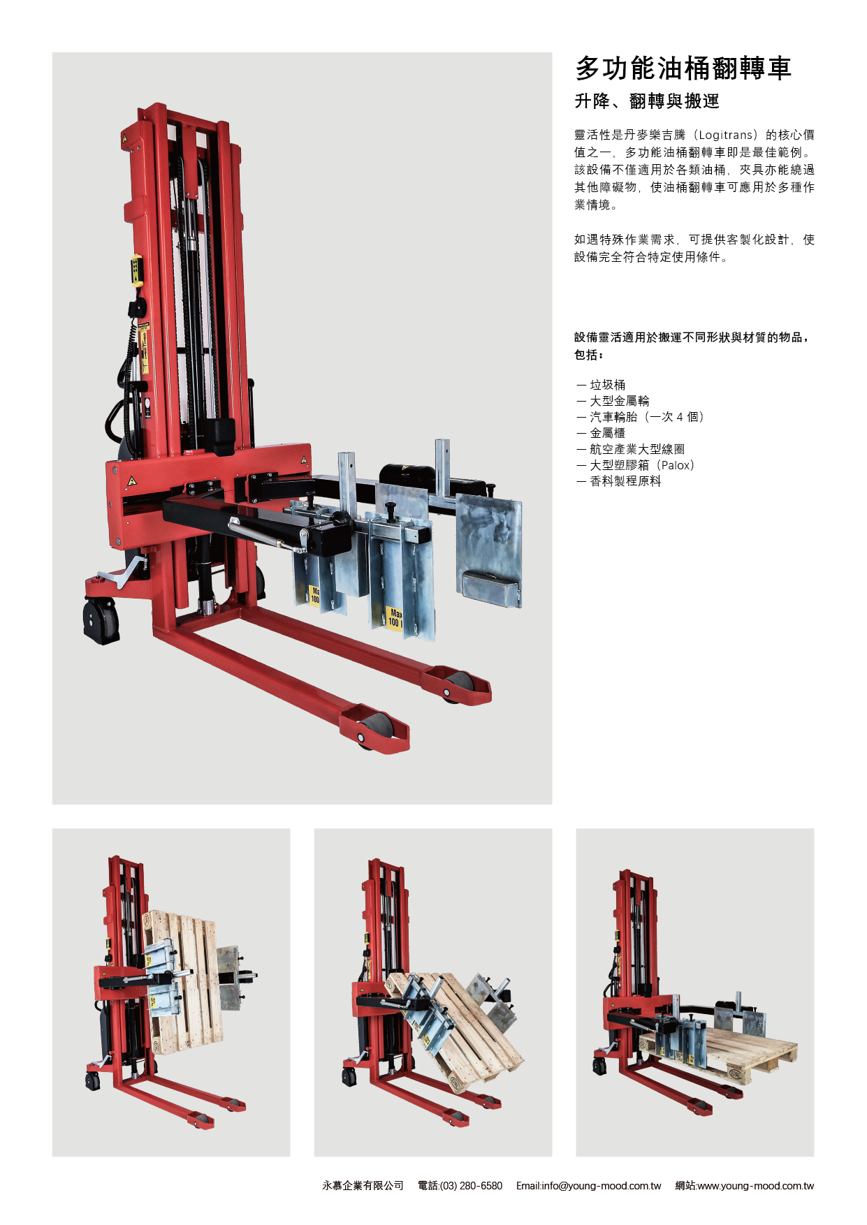 LOGITRANS 的桶類翻轉車是一款高效、安全的油桶搬運設備,專為提升作業效率與安全性而設計。其可旋轉360°的功能,允許操作人員輕鬆翻轉油桶,適用於各種倉儲與製造環境。桶類翻轉車支援鋼製與塑料油桶,並提供多種選配附件,滿足不同作業需求。其堅固耐用的設計,確保長時間運行中的可靠性與低維護成本。